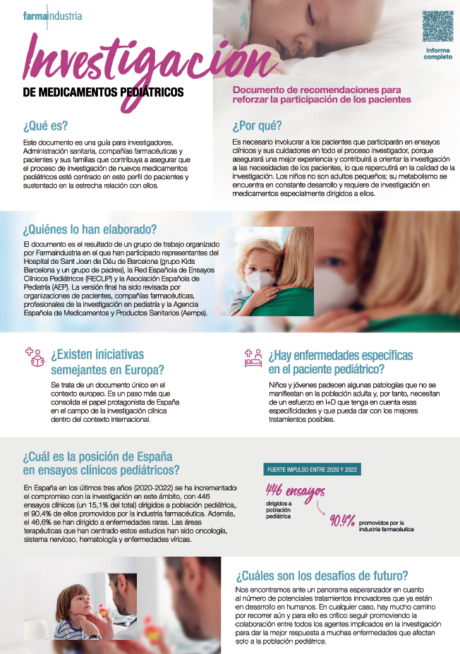 Esta guía, fruto del trabajo realizado por Farmaindustria, el Hospital Sant Joan de Déu (con la participación del grupo Kids Barcelona y un grupo de padres), la Red Española de Ensayos Clínicos Pediátricos (RECLIP) y la Asociación Española de Pediatría (AEP), tiene como objetivo asegurar que el proceso de investigación de nuevos medicamentos destinados a tratar a la población infantil esté centrado en este perfil de pacientes y sustentado en la estrecha relación con ellos.